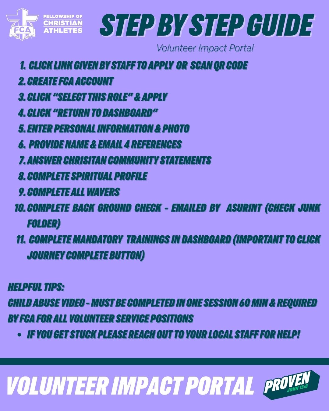 Ready to make a difference through FCA? Apply to become a Ministry Volunteer by completing our Volunteer Application. (VIP) This is required for all volunteers serving the ministry of FCA.